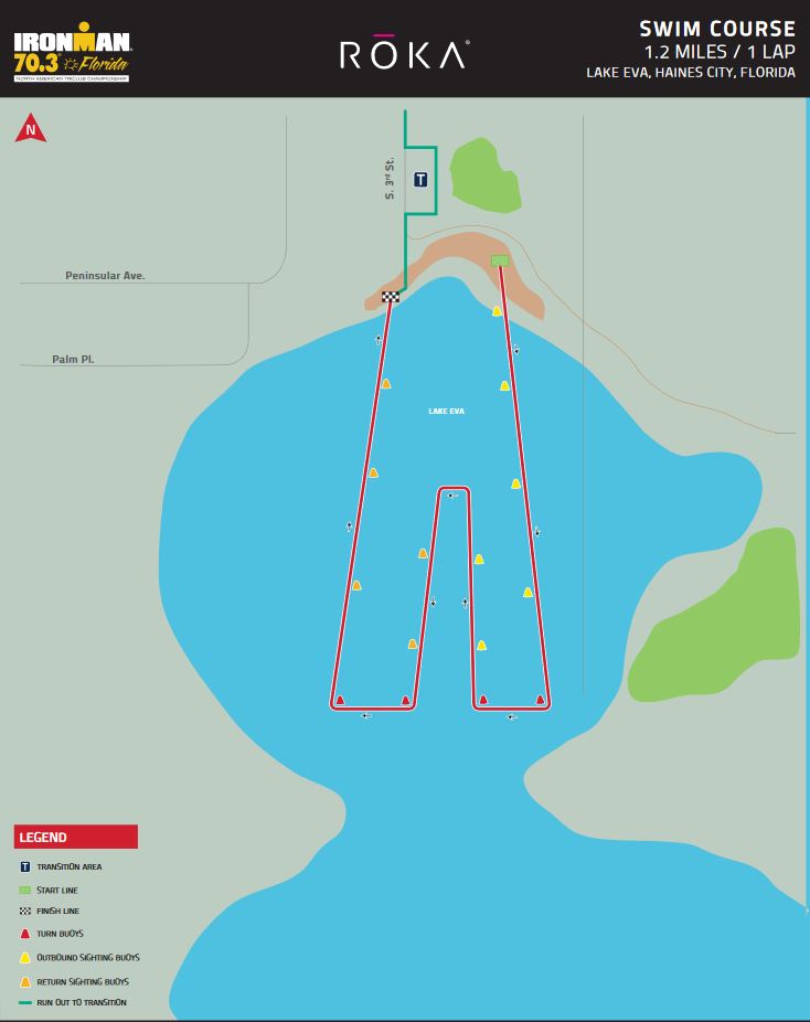 The swim will most likely be a two loop course in Lake Eva following the pants pattern… It is a small lake but not shallow to the degree you will touch the bottom. Imagine it will be crowded on the second loop. Think washing machine and lots of slowdown at the turns…